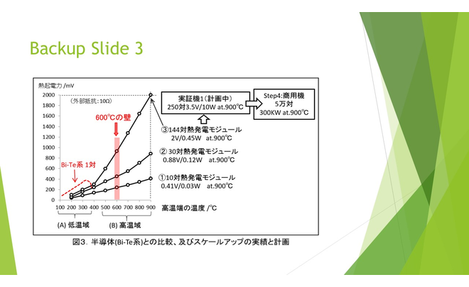 汎用金属と汎用セラミック部材を用いた発電ユニットの高温端の設計最適化と中間部の断熱及び低温端の空冷ファンの設計最適化等に配慮した実証機(出力>10W)を作製し、高効率化と大出力化が可能であることをサポートするデータを取得します。その後はオフグリッドでの電力供給のために段階的な大出力化を進めます。7月23日締切のJST公募事業A-STEPに応募しましたが、プランBとしてPR活動をしています。