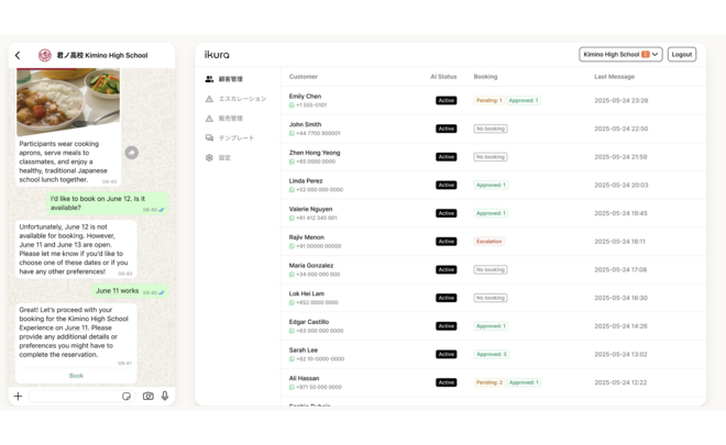 ikuraは最新のAIを活用し、訪日外国人向けにWhatsAppで予約・問い合わせ対応サービスを提供。旅行者は使い慣れたツールで簡単にやり取りでき、商業施設や観光事業者は言語・デジタルの壁を越え、業務効率化、利益率向上、顧客満足を実現します。