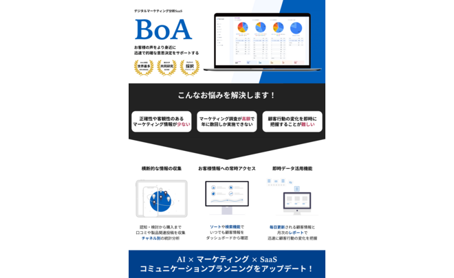 化粧品業界向けのAI駆動マーケティング最適化ツールです。オンライン上の口コミや投稿を収集・分析し、リアルタイムで消費者トレンドを可視化。NLP技術でRatingとの相関を解析し、因果関係を明確化することで、データに基づく施策を提案します。認知・検討・購入の各チャネルでの分析、課題抽出、SNS投稿生成やキーワード選定などの実行機能、効果測定までを一貫サポート。さらに、競合分析、インフルエンサー影響力評価、消費者セグメンテーション、予測分析を搭載。ブランドは消費者の嗜好変化に迅速に対応し、パーソナライズドマーケティングを実現。競争力を高め、売上向上を促進します。