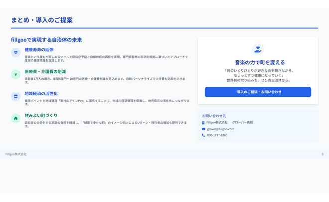 順天堂大学教授陣の監修と、サイバーエージェント社開発の自律神経測定エンジン「CARTE」に基づく科学的根拠で設計されており、健康寿命の延伸・医療費削減(高齢者1万人規模で年間6〜10億円削減効果を想定)に寄与します。fillgooは、アインPayの「認知拡大」「利用継続」「地域通貨の多用途化」という目的に直結し、住民の楽しみと財政効果を同時に実現する、新しい街づくりモデルを提供します。