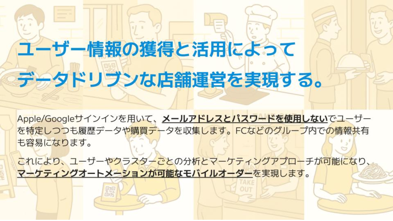 二つ目は、一般の現金会計やタブレット注文などの「非ログイン型の購入・決済システム」です。こちらは入力情報がないか少ないためユーザービリティは悪くないですが、個人を特定したデータの収集は困難で、集客やマーケティングなどその後の経営に活かすデータ量は限定的です。