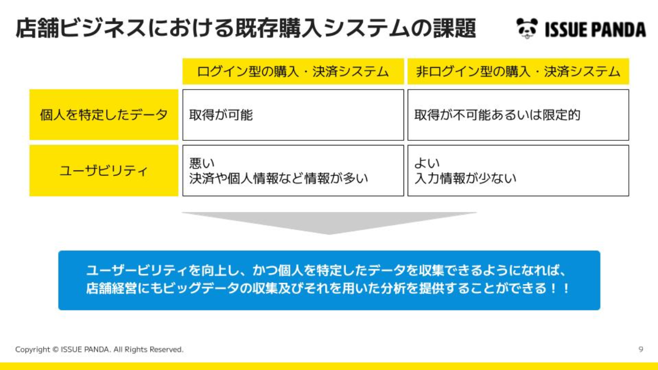そこで私たちは、ユーザーを特定可能なかたちデータを収集でき、かつユーザーにメールアドレスやパスワードの入力を求めない購入・決済システム『ISSUE PANDA(イシューパンダ)』を提供しています。