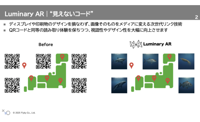 Luminary ARは、画像に独自の光信号を埋め込む技術を用い、スマートフォンで読み取ることで非接触かつ円滑にウェブコンテンツへ誘導する先進のARリンク技術です。紙面やポスターに掲載された写真やイラストそのものにリンクを埋め込むため、デザイン性を損なうことなく自然に導入可能な点が特長で、ブラウザから即時に体験いただけます。2025年7月にベータ版をリリースし、展示会やイベントにおいて実績を積んでおります。既存の紙媒体やビジュアル資産にデジタル接点を付加することで、顧客行動の導線強化およびマーケティング効果の向上、新たな体験価値の創出に寄与いたします。今後も教育、観光、文化など多様な分野への展開を目指しております。