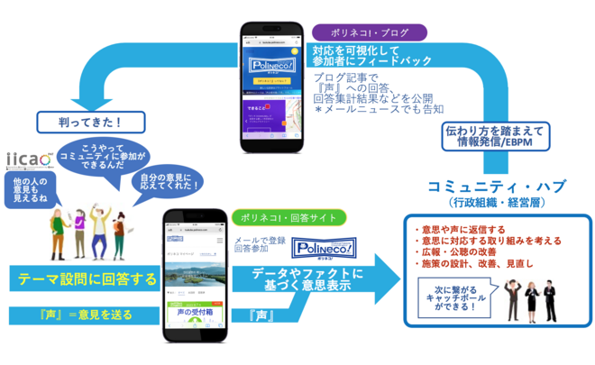 ・『ポリネコ!』は、先入観や誤解に基づく意思が民意となる既存のコミュニケーションの脆弱性を克服し、データやファクトに基づく意思表示を継続的かつ政策形成につながる形で行うことができるコミュニケーションです。(特許取得技術)