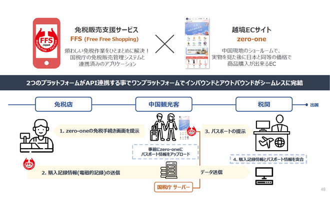 zero-one×FFSでは「地域のPR → 訪日誘致 → 観光消費 → 越境ECでの継続購入」という流れを一気通貫で実現します。