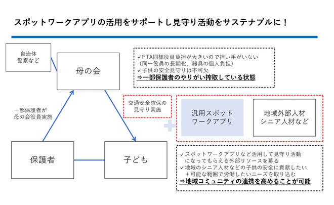 現在、交通安全母の会は子供の安全を守る崇高な理念のもと、自治体・警察からやりがい搾取され、疲弊している。 母の会役員を過度の負担から解放するためDX導入コンサルティングし、外部人材が活用可能にする。 自治体・警察には持続可能な活動には相応の負担が必要であること理解していただく。 地域のシニア人材が有償で見守り活動に参加できるようになることで、コミュニティの連携向上が期待できる。