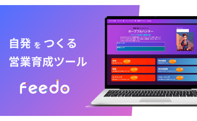 Feedoは、専門性が上がっている営業職の育成を実現するWebサービスです。営業に必要な知識はクイズとしてメンバーに出題ができ、お客さんの前で話せる知見へと昇華させます。マニュアルではインプットのみで「わかっているつもり」になっていたことをアウトプット重視のシステムで使える知識にします。また、営業に求められる課題解決の能力を鍛えるために課題を考え続けられるような、ゲーミフィケーション設計でメンバーの活躍への道を途絶えさせません。
