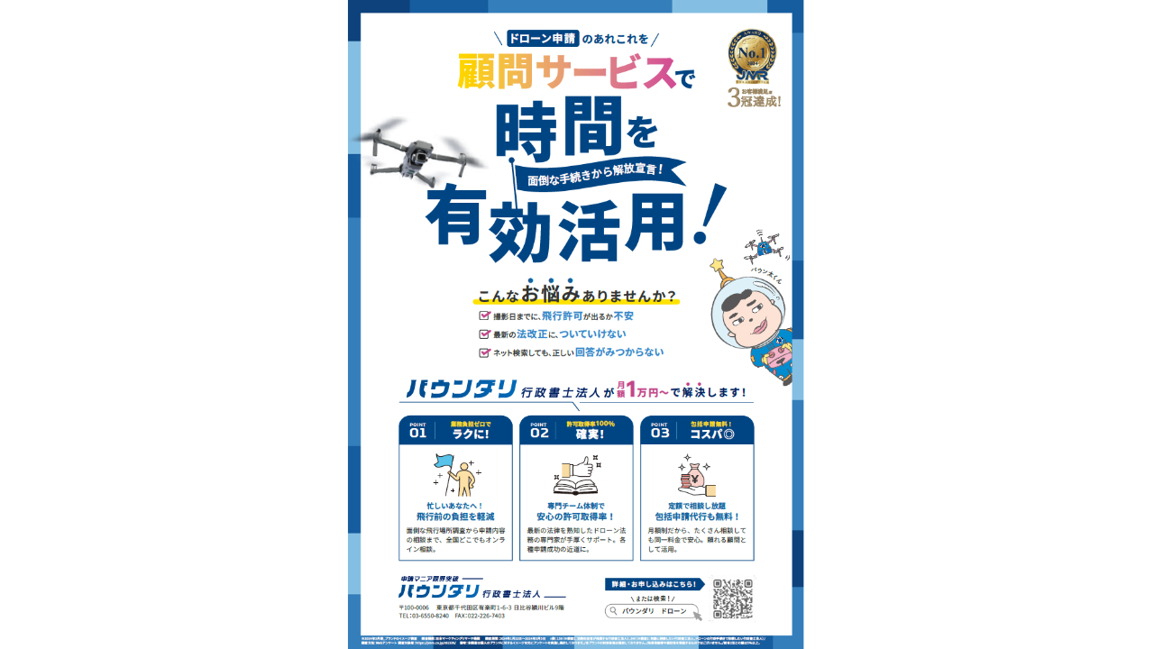 バウンダリ行政書士法人が提供する「ドローン飛行許可支援」は、ドローンを安全かつ法令遵守のもとで活用するための制度対応を専門的にサポートするサービスです。飛行許可・承認申請から、登録講習機関の設立・監査対応、運営支援、継続的な制度アドバイスまで、全国の事業者・自治体を対象に年間1万件以上の申請実績を誇ります。初めて制度に触れる方でも、わかりやすく実務に即したサポートを受けられるのが強みです。手続きの壁を越え、事業に集中できる環境を法務の力で実現します。