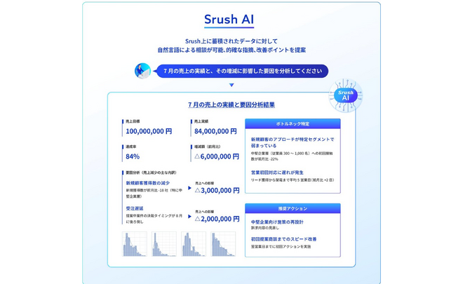 「SrushAI」は、データ基盤とAIが一体となっている点を特徴とし、企業のデータ活用力を飛躍的に高める性能を備えています。