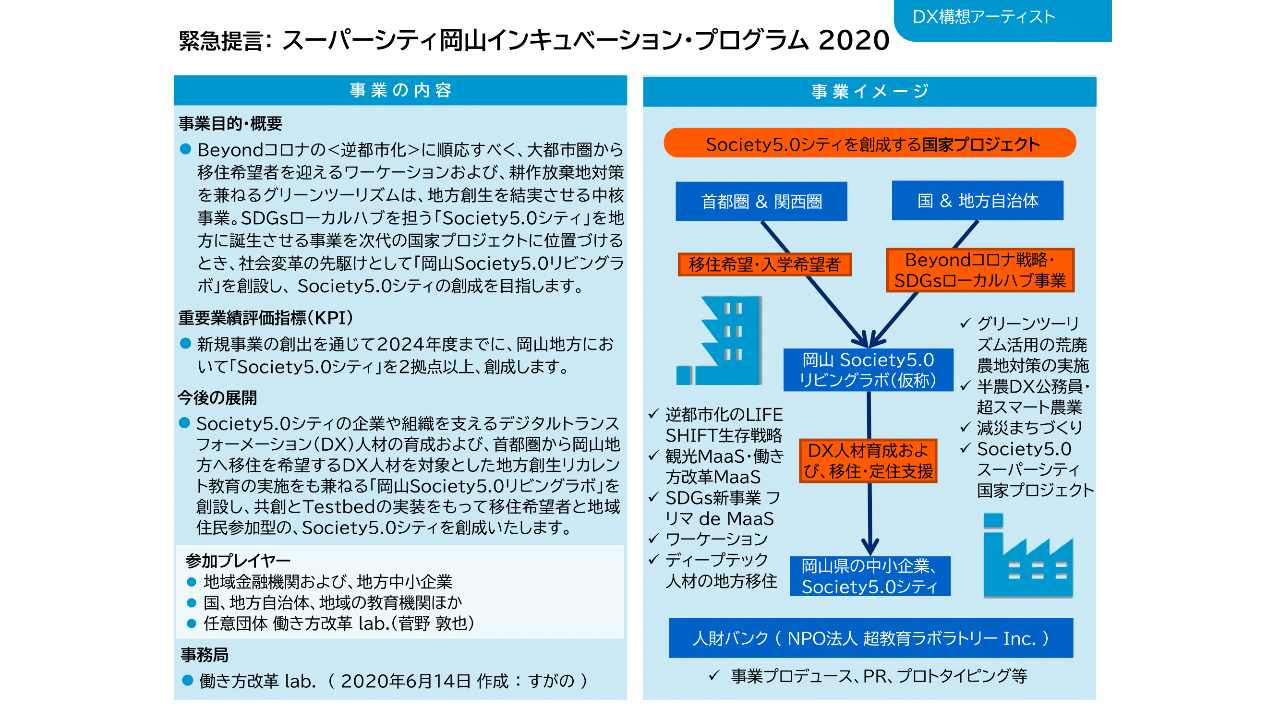 突出した専門性を有する実務家が集うホラクラシー組織の現在の事業は、「スーパーシティ」構想の地域での理解を深め、自治体による事業応募を促す活動。DXオウンドメディア力を活かし議会と協業を試みるなど、暮らす人々の生活を便利にして心豊かな社会を創るためのデータ連携基盤整備事業の導入に向けて邁進いたします。2021年2・3月頃の公募締め切りまでの応募を本事業のKPIに設定し、地方議会ならびに地方公共団体との協業に注力しています。