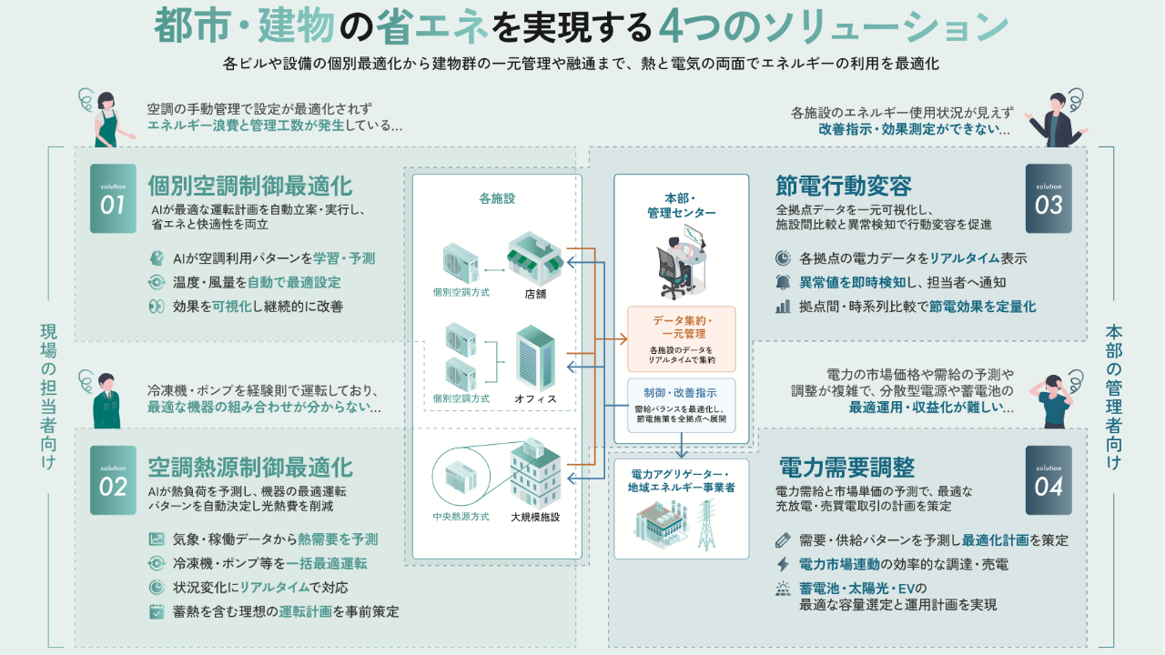・個別空調制御:AIによるリアルタイムな空調最適化で、快適性と省エネの両立を実現
