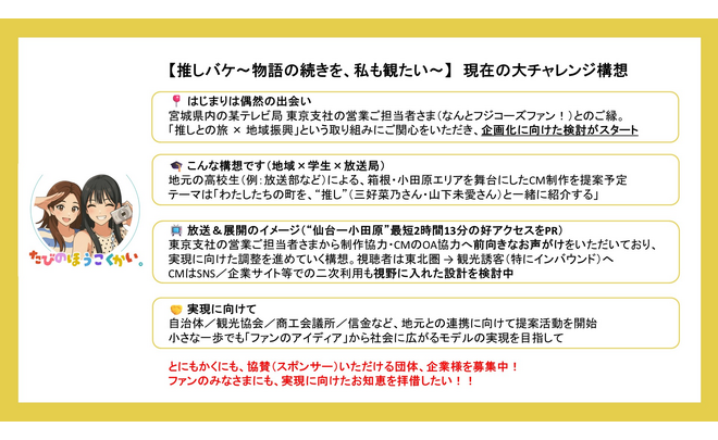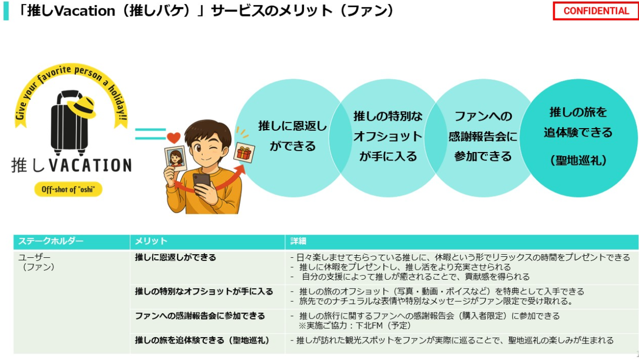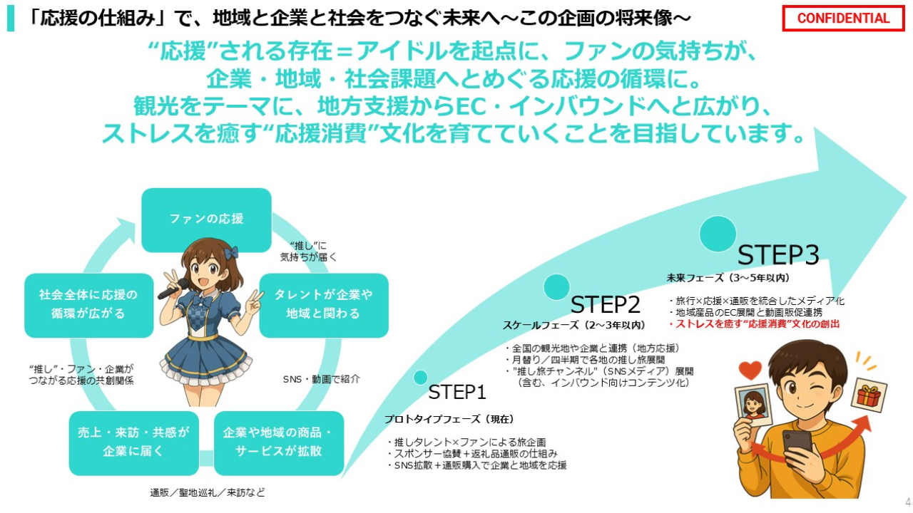 私たちは、推し活の熱量を旅や物産、交通施策と結びつけ、ファン・地域・企業が一緒に育てる応援経済圏をつくりたいと考えています。