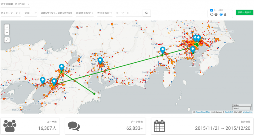 これまでのルート表示機能は、訪日外国人観光客の移動を俯瞰する機能でしたが、今回のアップデートにより、訪日外国人観光客の移動経路をさらに詳細に把握する事ができるようになりました。