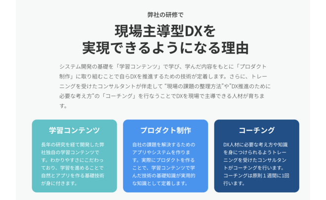 ノーコード技術を活用することによって企業のDXを推進できる人材を短期間で育成できるオンライン講座を提供しています。