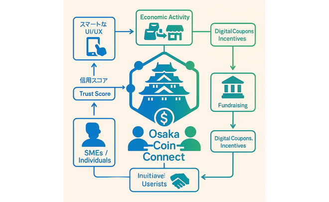 大阪・関西地域の経済活性化と中小企業・個人事業主の資金調達機会拡大を目指す革新的な地域デジタル通貨プラットフォーム。ブロックチェーン技術を基盤とし、地域内の商取引や決済データを活用することで、これまで見えにくかった中小企業や個人の信用を可視化。地域内の消費活動、例えば地域店舗での買い物や地元サービスの利用、ボランティア活動への参加などが信用スコアとして蓄積。金融機関と連携した新しい与信モデルの構築に役立ち、中小企業が必要な時に適切な資金調達ができるよう支援し、また、地域限定のデジタルクーポンや、イベント参加によるインセンティブ付与など、地域住民の経済活動を促す機能も搭載。高齢者やITに不慣れな方でも直感的に使えるシンプルなUI/UXを追求し、スマートフォンだけでなく、地域に設置された専用端末でも利用可能にすることで、デジタルデバイドを解消し包摂型フィンテックを実現。外国人観光客や労働者に対しても、多言語対応と簡便な送金機能を提供し、大阪への「ヒト」と「カネ」の呼び込みを強化。単なる決済手段に留まらず、地域コミュニティを活性化させ、信頼に基づく持続可能な地域経済圏を大阪から創造する。