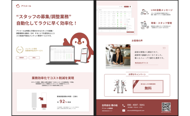 アツメールは時間と手間のかかるスタッフの募集・調整業務や給与計算、請求書作成を自動化(DX)することで生産性向上とコスト削減が可能なスタッフ配置・管理サービスです。スタッフの募集・調整に必要な連絡が「LINEメッセージの自動送信」で完結。現場情報やスタッフ情報をオンラインで一元管理することで、生産性向上とコスト削減を実現します。