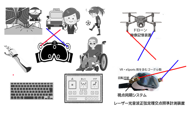 さらにレーザー光音波正弦定理交点照準計測システムと眼球追跡センサーを用い、レーザーに反応する光センサ―をリモコンやキーボード等に埋め込むことで、ユーザーの粗点がレーザー交点となり、非接触で、見てまばたきするだけでスイッチ等の操作等も可能。