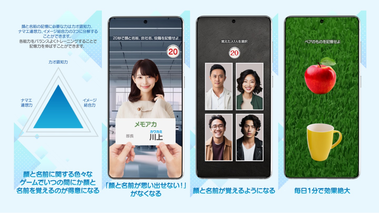 顔と名前は漠然に覚えてもなかなか覚えられるようにはなりません。体系立てて脳トレをやる必要があります。本アプリでは以下の3つの力をバランスよく総合的に、または足りない力を集中的に鍛えることで記憶力を高めます。