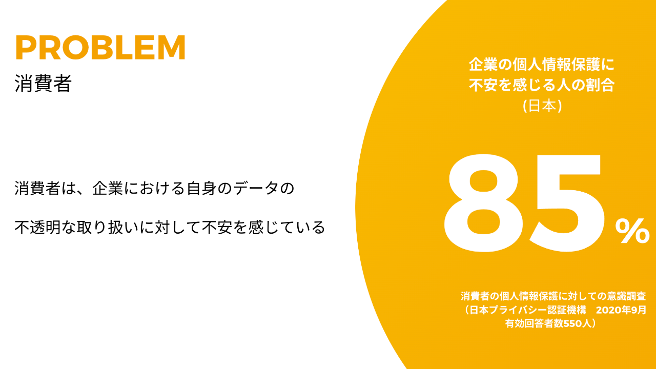 現代では、個人のデータが無断で収集・利用されることでプライバシー侵害への懸念が広がっておりますが、個人は信頼できる適切な企業にはデータを活用して自信へのサービスの価値向上には繋げて欲しいとも思っています。一方、企業側は詳細な顧客データを得られないため、統計的アプローチに依存し、効果的な施策を打てずにコストを浪費している現状があります。これらの課題をDataUsは解決していきたいと考えております。