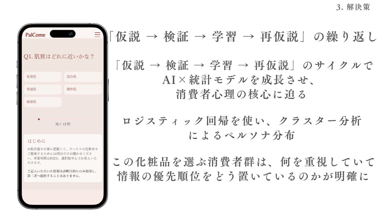 実際にその化粧品を使っていただき、効果検証。統計分析から効果の測定を図る