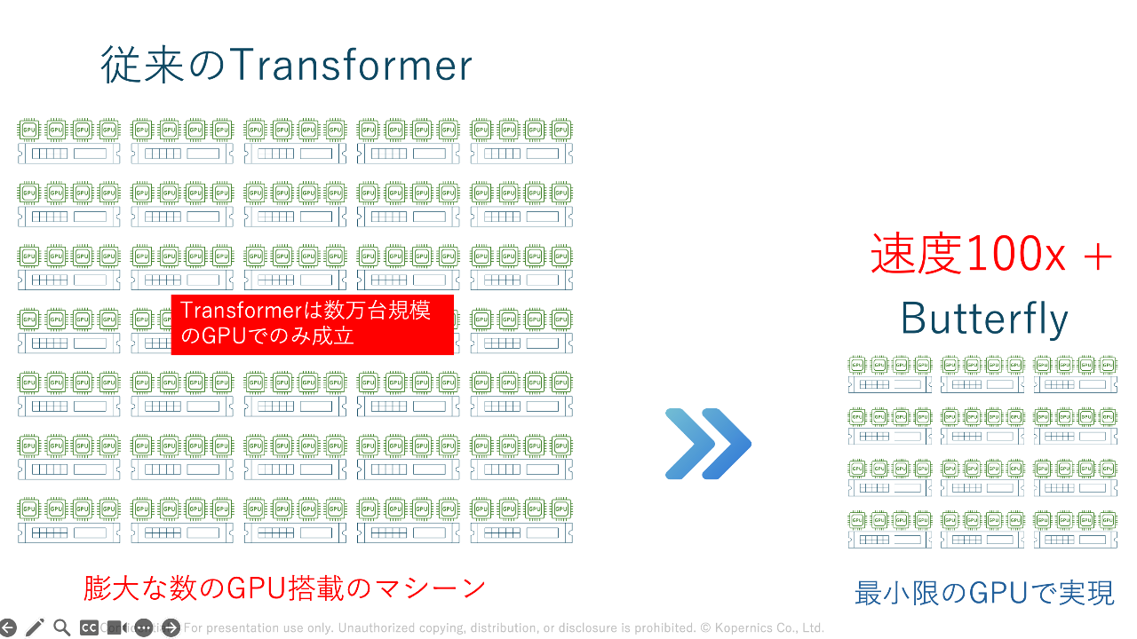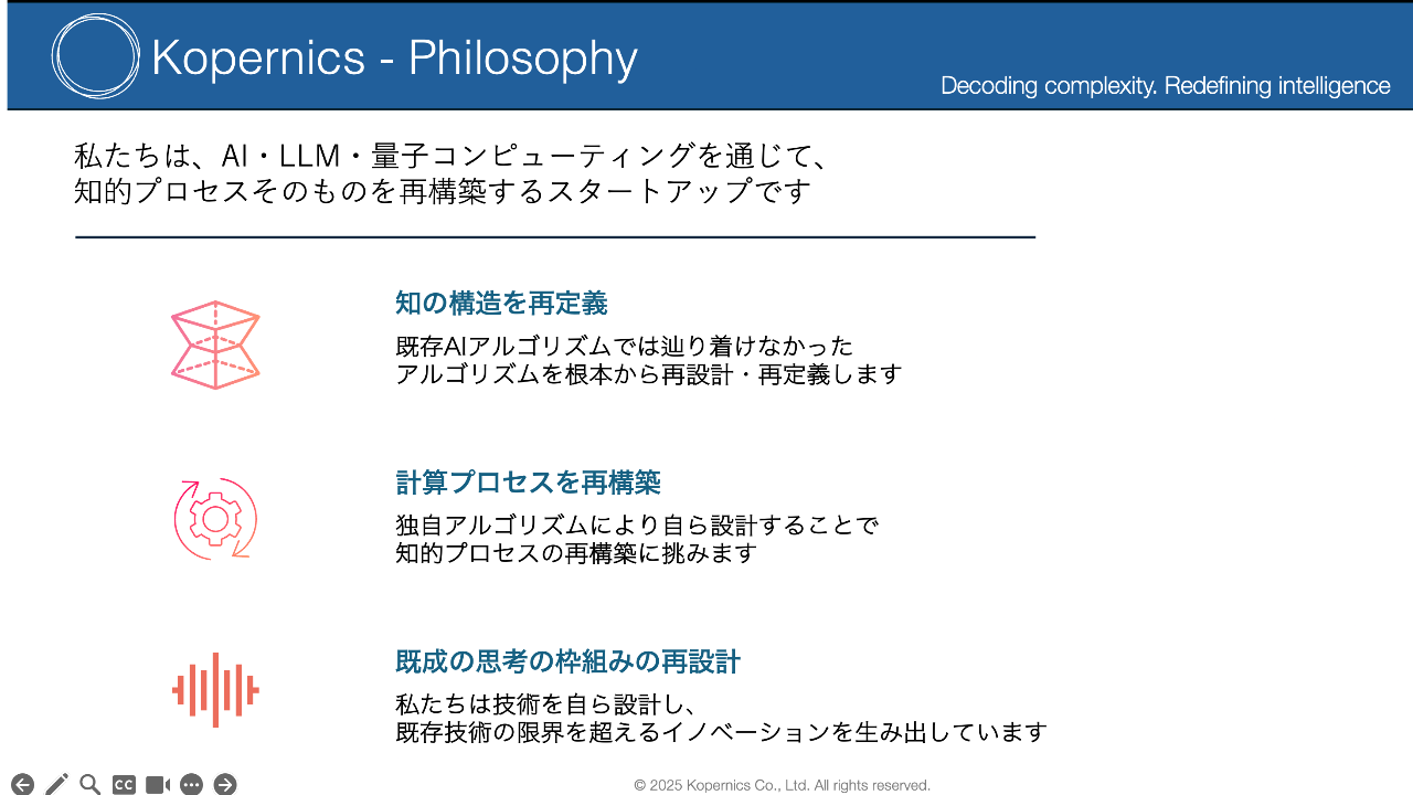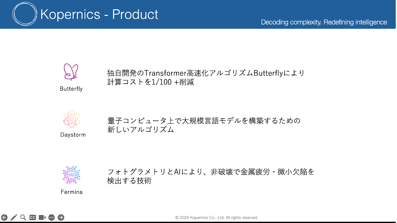 コペルニクスを始めた理由は、既存のAIの延長では社会の根本課題を解決できないと考えたからです。多くのAI研究は枠組みの改良にとどまり、「AIとは何か」「知性とは何か」という問いに十分向き合ってきませんでした。私たちはAIを単なる道具ではなく挑戦のテーマと捉え、根源的な問いにプロダクトを通じて答えようとしています。その一つが、計算効率の壁を打ち破るアルゴリズム「Butterfly」です。従来数千台のGPUを要した大規模学習を大幅に軽減し、誰もが使える知識処理基盤を目指します。もう一つが「Fermina」で、人間の目では困難な金属の微小劣化をAIで検出し、安全と信頼を高めます。両者はいずれも人間の限界を超え、新しい知的基盤を築く挑戦です。私たちの目標は技術開発にとどまらず、社会の信頼性と持続可能性を高め、人々が安心して暮らせる未来を実現することです。そして次の挑戦として、量子コンピューティングを応用した「Daystorm」にも取り組み、従来計算では困難だった大規模問題の解決や未知の知識創出を目指し、未来の知的基盤を切り拓こうとしています。