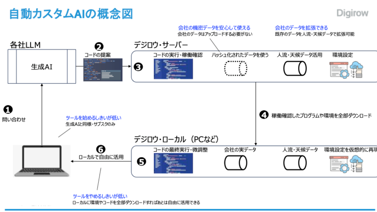 デジロウは「AIを民主化し、誰もが活用できる未来」を目指しています。企業が持つデータに価値を与え、収益向上や業務効率化を実現するカスタムAIを提供。セキュリティを重視し、機密データを守りながら短期間・低コストで導入可能な仕組みを構築します。人とAIの共創を通じて、企業の競争力を最大化することが私たちの使命です。