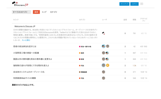 オープンソースの次世代ディスカッションプラットフォームとして有名なDiscourse(http://www.discourse.org)を使用。