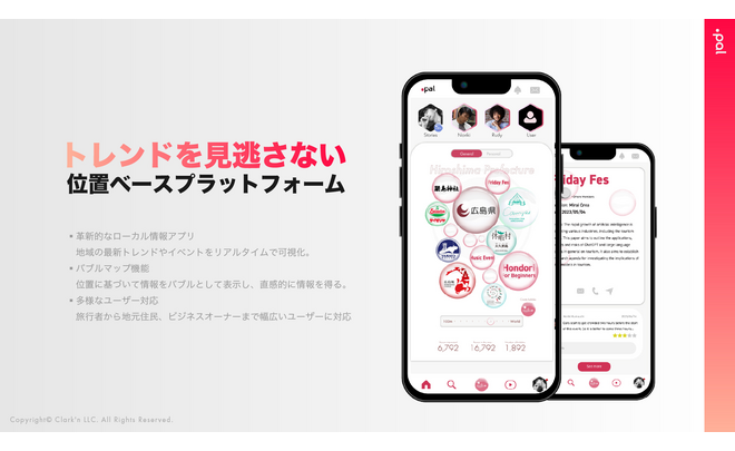 .palは、情報過多の現代社会に対応するために開発された革新的な情報プラットフォームです。このアプリは、リアルタイムのトレンドやイベント情報をバブルマップで視覚化し、地域ごとの動きを一目で把握できる点が特徴です。たとえば、街中のイベントや新しいレストランのメニュー、さらには事故情報まで、さまざまなローカル情報を迅速に確認できます。
