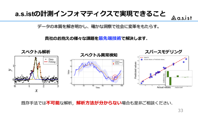 本サービスでは、ベイズ推論と呼ばれる統計手法を用いた計測データの解析手法の構築を行います。この解析手法によって、ノイズの大きいデータやビックデータの解析が可能になり、今までの計測装置で出せなかった測定精度を実現します。顧客の課題に合わせて、データ解析レポート作成、データ解析ソフトウェア、計測機器への組み込みソフトウェア、研究開発など幅広い提供形式に対応しております。