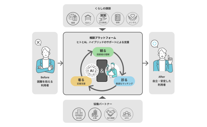 当社はワーキングプアをなくすことを目的としたソーシャルスタートアップです。無料キャリアカウンセリングサービスプラットフォームやAIによるキャリアマッチングなどの開発提供を行い、Gov techとして自治体と協働しテクノロジーを用いた「氷河期世代」や「ひとり親家庭」「非正規労働者」「ヤングケアラー」「女性の再就職」「シニアの低所得化」などの貧困に直結した社会課題に取り組んでいます。
