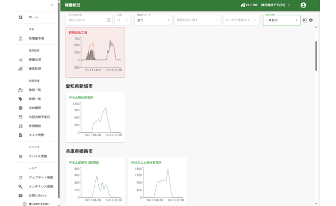 主に太陽光発電所向けのエネルギーマネジメントAIoTプラットフォームの提供しています。 各種センサでデータを自動取得してクラウドへ送信、異常検知後、自動化フローにより、タスク起票や制御等のオートメーション化フローを組むことができ、自動監視を実現しています。