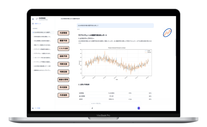 我々が提供するOVERSEEは、リアルタイムに社内外の情報を自律的に学習し、対話だけで予測と判断を実行。部門やシステムを横断し、需要起点の意思決定を支える次世代予測AIエージェント。