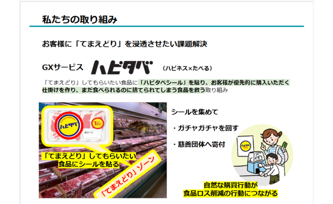 「ハピタベ」は、消費期限の迫る食品を買ってもらうべく専用シールを貼り付けて、てまえどり(消費者が食品を購入してすぐに食べる場合に、商品棚の手前にある販売期限の迫った商品を積極的に選ぶ行動)促進を図る仕掛け。