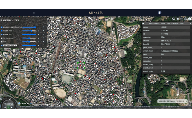 MiraiE。あいは、行政・企業が保有するデータや現場情報を統合し、将来起こりうる課題を「見える化」して先手の対策を支援する予測サービスです。災害・インフラ劣化・空き家化など、発生後の対応ではコストも被害も大きくなります。本サービスは、地域・施設・対象者ごとにリスクの兆候を抽出し、介入の優先順位と具体的な打ち手の検討材料を提供します。担当者の経験に依存しがちな判断をデータで補強し、限られた予算と人員で最大の効果を狙える意思決定へ。事後対策に追われる運用から、予防・未然防止を軸にした運用へ移行します。