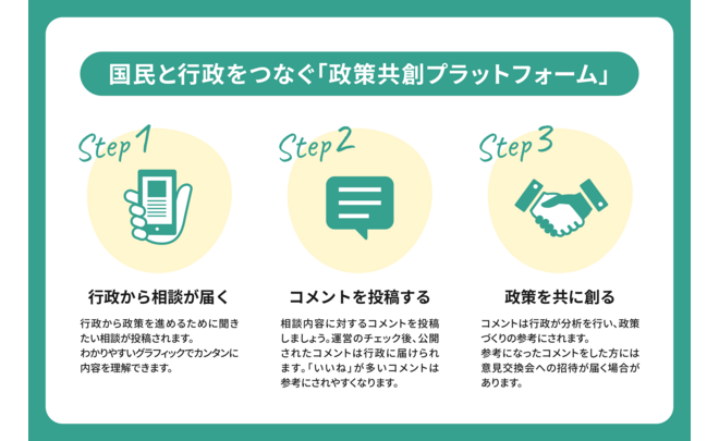 PoliPoli Govは、人々と行政がともに社会を創るための「政策共創プラットフォーム」です。オンラインで気軽に、行政にアイデアを届けることができます。国民や住民の行政に対する意見や要望を聴く活動(=広聴)をデジタル時代に対応した新たな仕組みへアップデートし、人々の幸せな暮らしに貢献します。