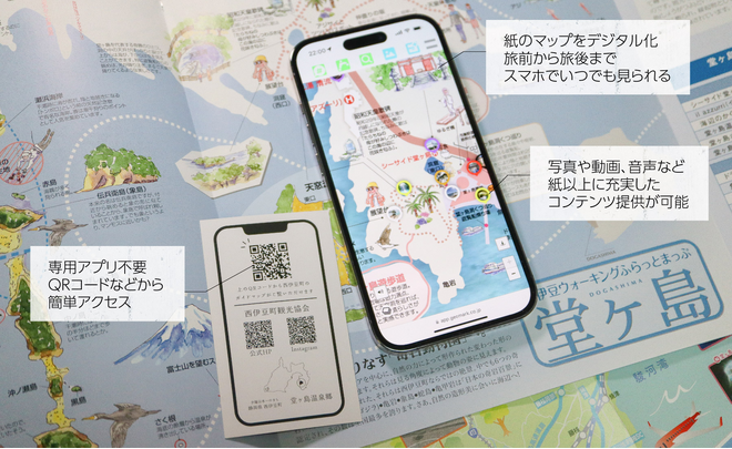 ジオ・マークは、地域に散在する観光情報、公共交通データ、商業情報などを統合し、移動と体験を一体で設計するクラウド型デジタルマップサービスを提供しています。絵地図の直感的な表現力とデジタルマップの利便性を融合し、利用者の回遊行動を促進するとともに、エリア内の滞在傾向や回遊状況を可視化することが可能です。公共交通については運行情報や導線を分かりやすく見える化することで利用促進を支援します。新たな大規模システム投資や複雑な事前準備を必要とせず、既存データを活用しながらエリア単位でスモールスタートできる点を強みとしています。