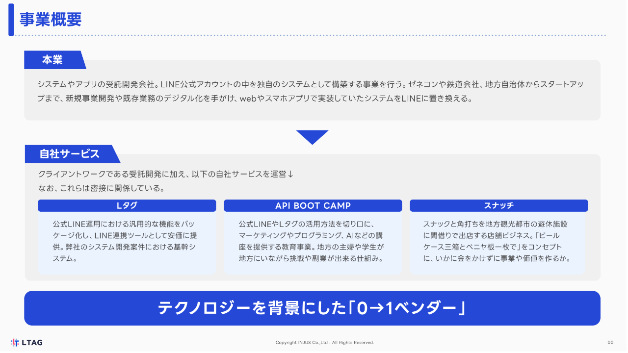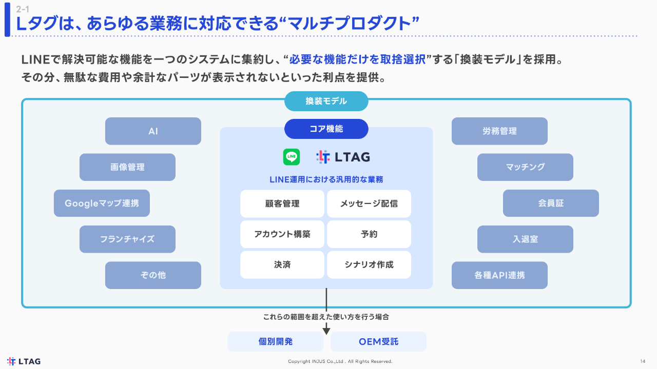 『Lタグ)』…公式LINE運用における汎用的な機能をパッケージ化し、LINE連携ツールとして安価に提供。弊社のシステム開発案件における基幹システム(特許2件取得済み)。