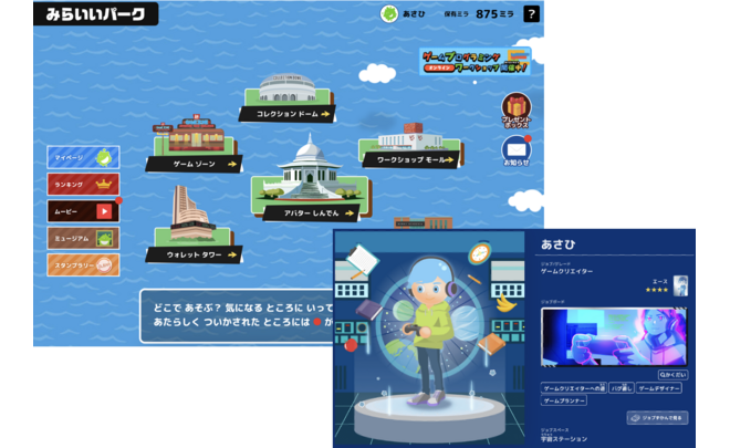 みらいいパークでは、職業になりきり、ゲームやワークショップ、コンテストで職業アバターを育成することができます。 ・ゲーム:職業の1シーンを体験できるゲーム 例)ゲームクリエイター:バグ直し ・ワークショップ:職業に関する実際の仕事に参加するワークショップ 例)ゲームクリエイター:ゲーム改善案出し ・コンテスト:自分の仕事をアウトプットするコンテスト 例)ゲームクリエイター:ゲーム改善案提出 企業とのパートナーシップでは、企業のメッセージを伝えるゲームやワークショップ、企業の困りごとを解決するコンテスト、工場や駅など企業のリアルなアセットと連携したプロジェクトなどを推進しています。 ・UACJとの取り組み事例:https://www.uacj.co.jp/release/20240827.htm ・京王電鉄との取り組み事例:https://prtimes.jp/main/html/rd/p/000000021.000048575.html