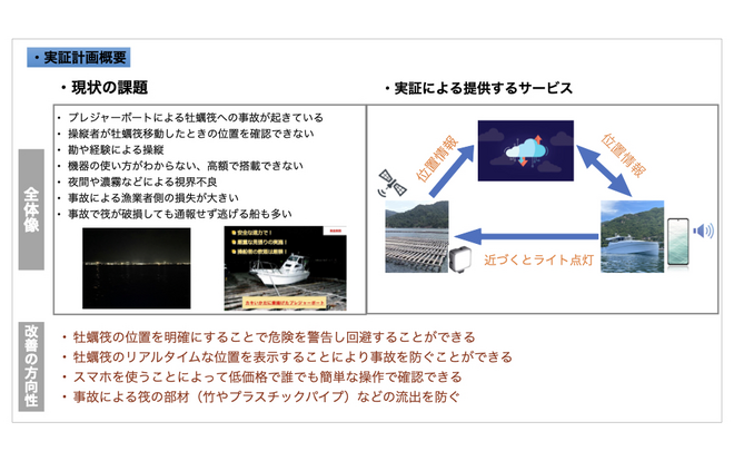 私が解決したい課題は瀬戸内海に存在する船舶と牡蠣筏の衝突事故です。 現在広島県の海上で起こる事故の60%強がプレジャーボートや漁船が関連し、そのうち多い割合を占めているのが乗揚の岩礁や牡蠣養殖筏に気づかなかったことが原因です。夜間などは牡蠣筏が見えないため非常に多い事故になります。事故を防ぐための装置はレーダや高性能マップがありますが高額なためすべての船舶に搭載されておらず、また搭載されていても使いこなせない実情もあります。 そこでプレジャーボートと牡蠣筏が互いの座標情報を共有することに加え、牡蠣筏そのものに高輝度のライトを付属した船舶のIoTシステムを搭載することで事故を防ぐことができます。 船舶側のサービスも価格を抑え複雑な機能を備えるのではなく誰でも使える機器を開発することにより、牡蠣養殖業者の機会損失を防ぎ、更にプレジャーボート側も経験や技量に左右されずに航行することが可能になります。まずは牡蠣筏の位置を明確にし、その後は養殖筏や定置網など漁具全般に展開していく予定です。現在はひろしまサンドボックスのRING HIROSHIMAにも採択され、実証実験を進めております。