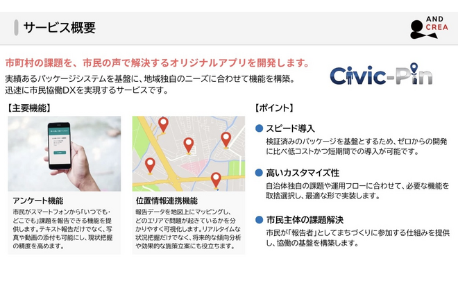 本サービスは、そうした地域課題を「市民の声」で解決するオリジナル報告アプリを開発するサービスです。