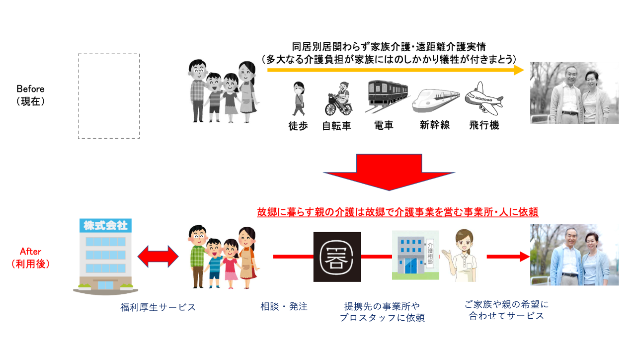 要支援・要介護およびその予備群の高齢者の生活の質(QOL)の維持と向上を目的とした、自費による在宅ケアサービスです。日本全国の居宅介護事業所と連携の上、利用者のニーズに合ったサービスの提供を実現します。その上で介護離職が起こらないよう、働き盛りの息子娘夫婦に安心してご依頼頂ける、自費介護プラットフォームマッチングサービスを展開致します。このサービスを通じて、利用申込者である息子娘夫婦と利用者である親御さんに対して「確かな安心と平穏な日々」をお届け致します。