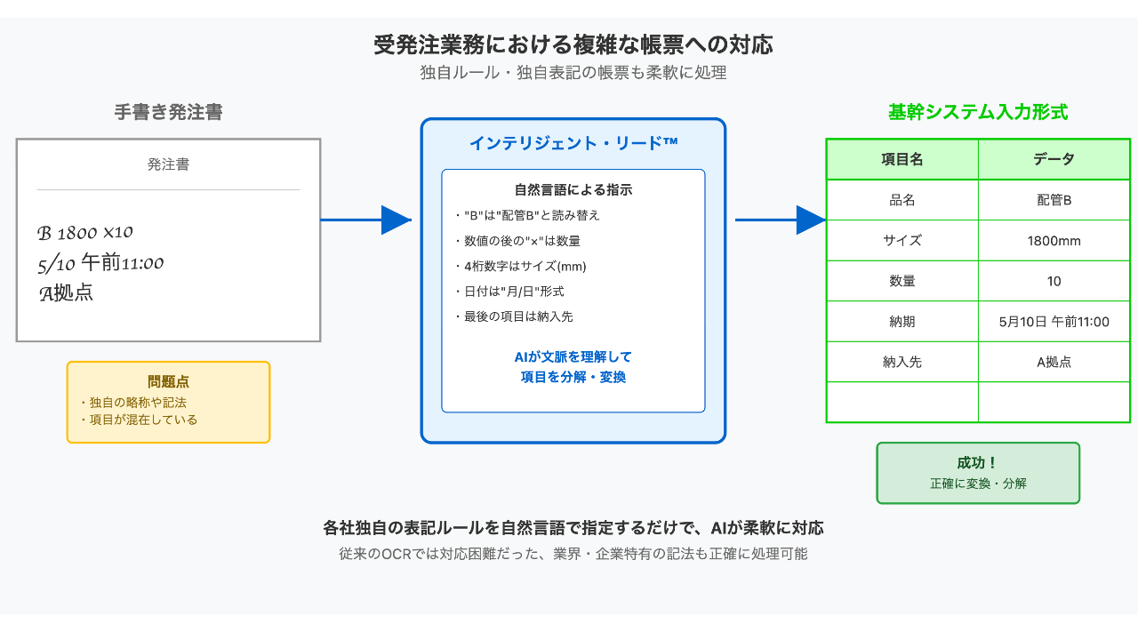 判読困難な文字も前後の文脈から正確に解析。受発注書類や図面など、あらゆる手書き文書の電子化を強力にサポート。