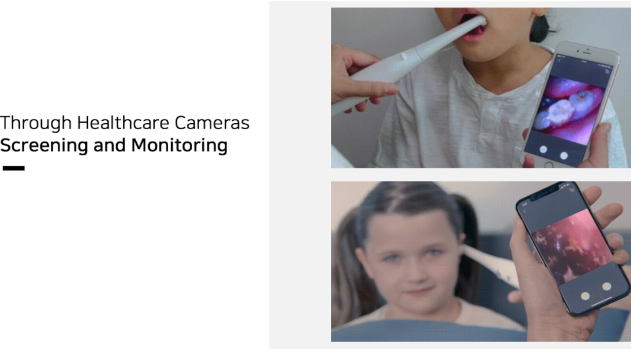 ヘルスケアカメラを活用した遠隔医療相談プラットフォーム 口腔や耳、鼻を詳細に撮影できるヘルスケアカメラと、これを基にアプリを通じて遠隔で医師と医療相談及び健康管理が可能。