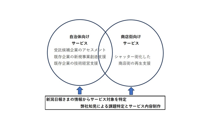 弊社は2022年末に湯沢町で創業したばかりの経営コンサルを主たる事業とする零細企業です。現在、湯沢町からは起業型地域おこし協力隊隊員活動支援業務を受託し、湯沢町商工会からは創業セミナー講師を委託されております。2023年4月以降、湯沢町・南魚沼市・魚沼市・小千谷市・新潟市での創業セミナーや新規事業開発セミナーを調査・体感した経験から、以下のような思いを持ちました。即ち、自治体から事業を受託した企業の知見の浅薄さからの脆弱なプログラムの実施、受講者に相応しくない情報の提供、受託企業を選択する際の適切な評価基準を持たない自治体での税金の無駄遣いなどです。また、シャッター街化した商店街に関しては、自治体も当該商店街団体もなすすべもなく傍観している状態が見受けられます。こうした問題意識から、湯沢町・湯沢町商工会に提案を行い、前記の業務を受託した経緯があります。さて、今回提案するサービスは新潟日報さまの保有情報を基に、自治体向けの地方創生事業の受託候補企業のアセスメントサービスを中心に自治体・既存企業の事業支援、および商店街の再活性化サービスを提供するものです。