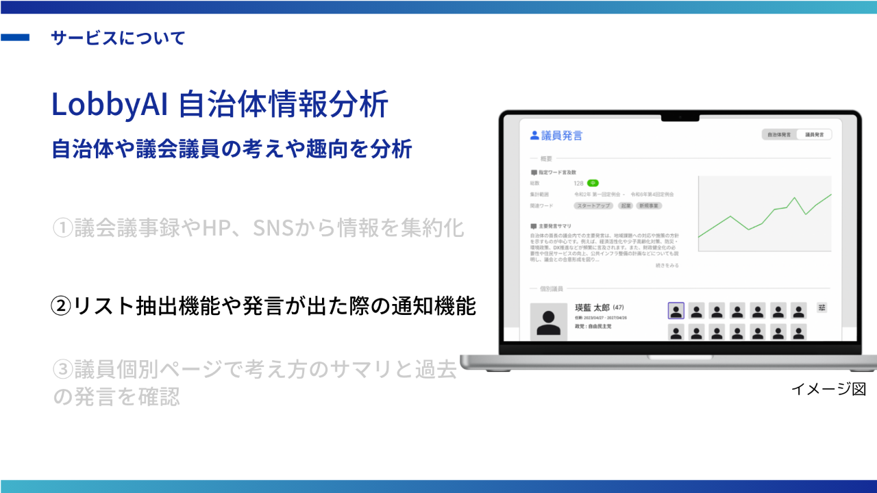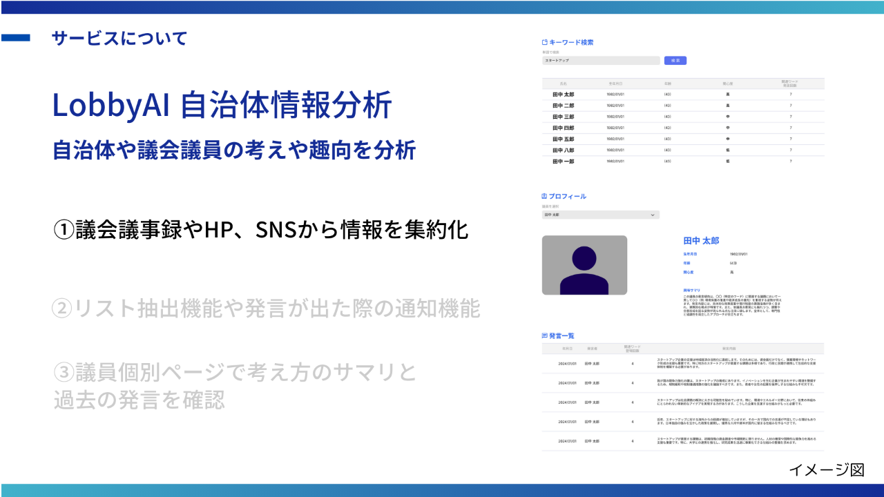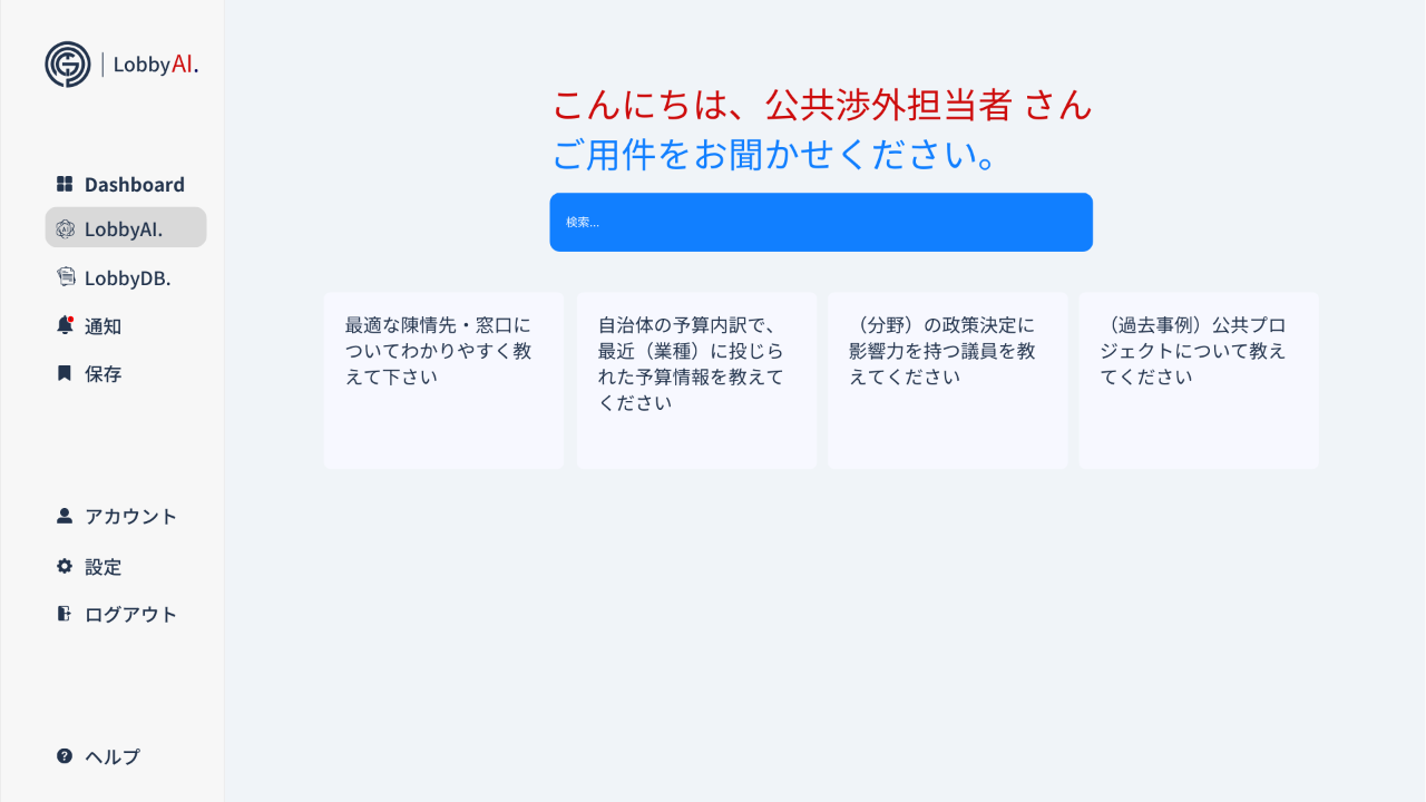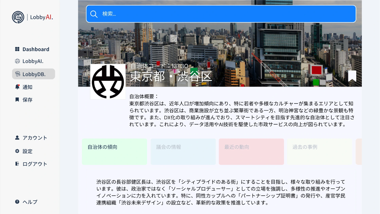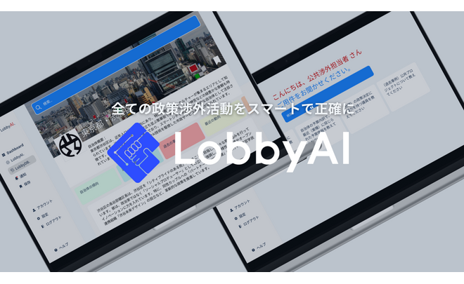 LobbyAIは、企業が自治体や政府と連携する際の調査コストを削減し、最適な窓口と効果的なアプローチ方法をリアルタイムで提案する公共情報分析SaaSです。DXやAIが未活用の公共政策プロセスにAIを導入し、スタートアップ企業や業界団体を起点に、「政治・行政」と「民間」の融合を目指します。