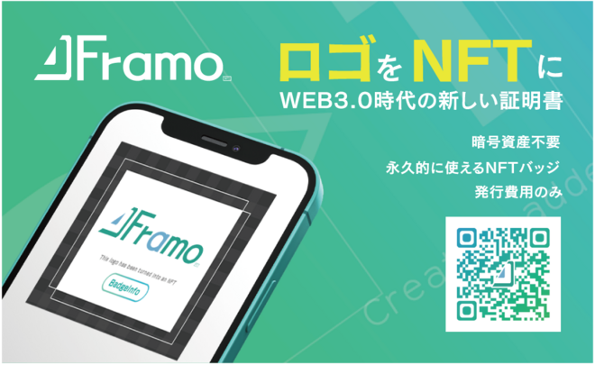 FramoはサービスのロゴやブランドマークなどをNFT化しWEB上に簡単にNFT画像を表示できる「NFT」バッチを提供するWEBサービスです。暗号資産不要、発行料のみで永久的にNFTバッチを使用できます