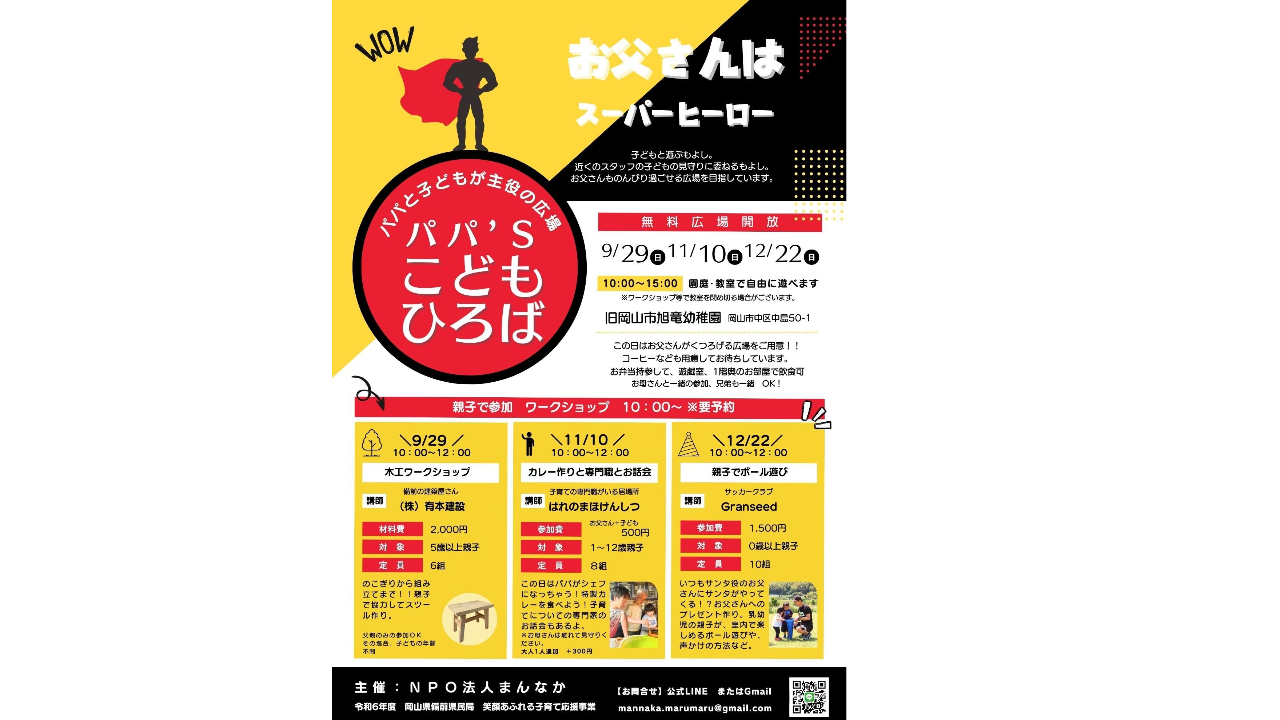 子育てしやすい環境づくりに貢献するため、町内会と協力し、閉園した幼稚園を活用(暫定的に)して、子育て広場、子どもの居場所多世代交流ができるイベントを主催。岡山市中区旭竜学区では児童館や子育て支援センター公民館がなく、乳幼児親子や子どもの居場所が徒歩圏内にないため。2021年より開始した活動を発展させ、最近は出張子育て広場や子育て支援者ネットワークづくりにも取り組む。