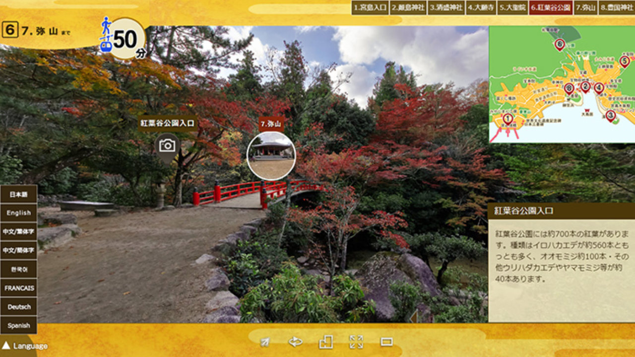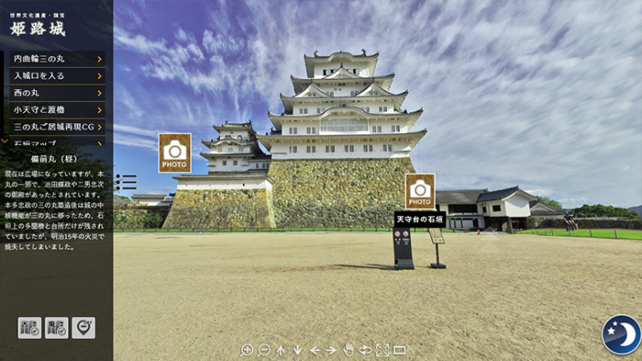 写真をはじめ、動画やテキスト、ナレーションなどWEB上で表現できるあらゆるメディアをパノラマ内に組み込むことができます。昼夜や季節を切り替えるシンクロ機能や英語や中国語といった言語切り替え機能などの特殊機能で、他社のパノラマコンテンツより高機能であることを自負しております。