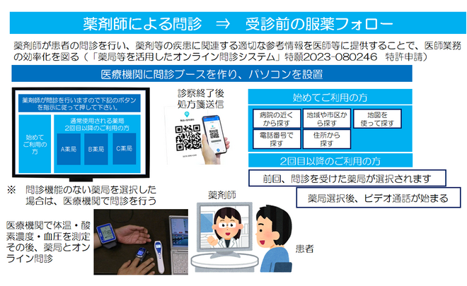 患者は、体調が悪いのに自分で考えながら次々と問診へ回答しなければならないストレスを与えられ、問診の品質は低下し、問診時における患者満足度も大きく低下してしまう恐れがある。また、医療機関での診療の後にさらに調剤薬局で重ねて同様の問診を受けるという負担は患者には納得できない。本システムをを利用することで問診時における患者満足度を大きく向上させ、薬剤師の専門性を生かして問診の品質を向上させることができ、医療機関と調剤薬局との双方で重複した問診が行われることによる患者側の負担や非効率さを回避して薬局での待ち時間を短縮することができ、薬剤師に服薬指導や薬剤交付後の服薬フォローアップ情報の収集の機会を確保させることができ、さらに薬局と医療機関との間で「医療機関で行っていた問診を薬局が行って医療機関に報告するという医療タスクシフトを伴う医薬連携」を実現し、患者に対する調剤薬局のコミュニケーション機会やビジネス機会を増加させて薬局の事業を活性化させることができる「薬局を活用したオンライン問診システム」を提供することを目的とする。