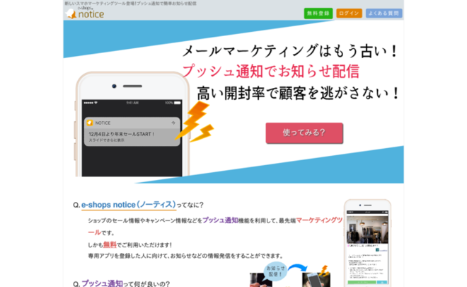e-shops notice(ノーティス)は、ショップのセール情報やお得情報、キャンペーンなどの最新情報をお客様に対してアプリのプッシュ通知を利用してお知らせするサービスです。これまでにメールマガジンのメールでの通知サービスはスマホの普及とともに効果が下がっています。今後はスマホアプリを使ったサービスの通知が効果的です。本サービスを使うことでアカウントを取得するだけでアプリ利用者にお店の最新情報をお知らせすることが可能になります。また、通知用のアプリは店舗別に用意するのではなく全店舗が共通でnotice(ノーティス)アプリを利用し、アプリユーザーは通知を受けたい店舗をお気に入り登録することで、ひとつのアプリで共通で使う事ができます。アプリで現在地周辺のお得なお店を探すことも可能になります。